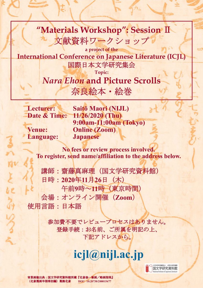 The National Institute of Japanese Literature (NIJL) is pleased to announce the Second Session of our new “Materials Workshops”series, to take place on 11/26 (Thursday), 9am-11am Japan time.