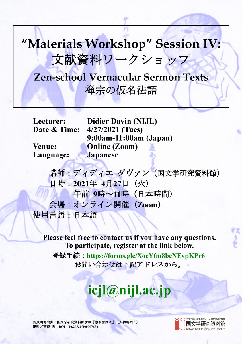 The National Institute of Japanese Literature (NIJL) is pleased to announce the Fourth Session of our “Materials Workshops” series, which now enters upon its second year. This time the workshop will focus on Zen-school vernacular sermon texts (kana-hōgo), and will be held online on April 27th, 9am-11am Japan time.