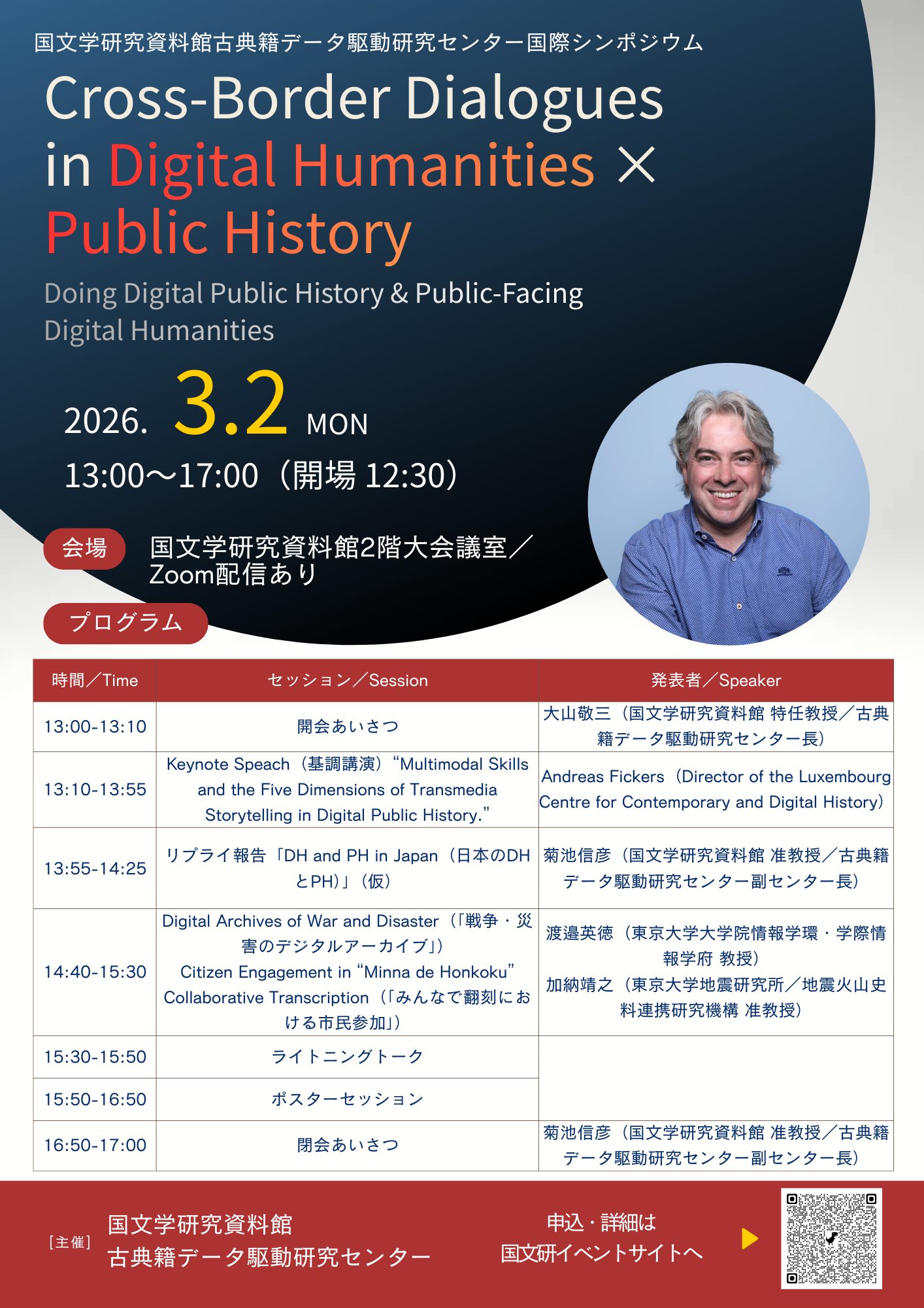 国文学研究資料館古典籍データ駆動研究センターでは、ルクセンブルク大学の現代史及びデジタルヒストリー研究センター(Luxembourg Centre for Contemporary and Digital History (C²DH))のAndreas Fickers教授をお招きし、国際シンポジウム”Cross-Border Dialogues in Digital Humanities × Public History― Doing Digital Public History & Public-Facing Digital Humanities”を開催いたします。