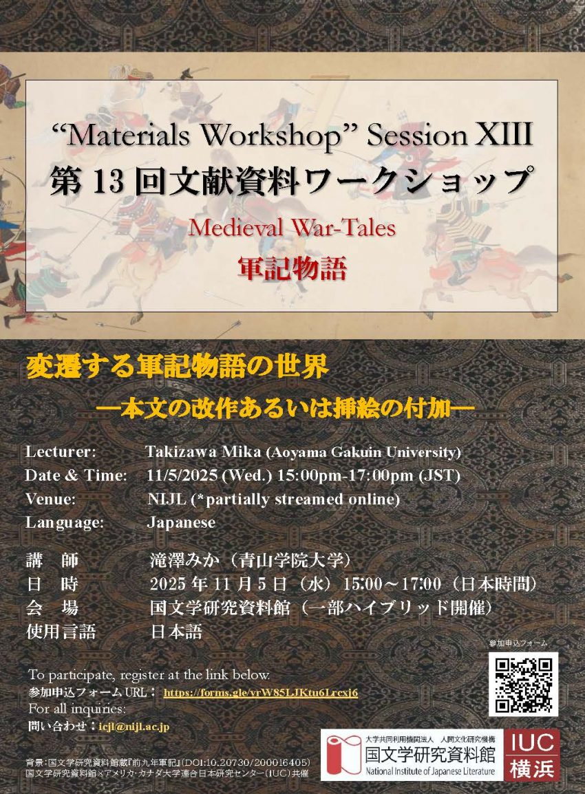 「文献資料ワークショップ」とは、国文学研究資料館(NIJL)とアメリカ・カナダ大学連合日本研究センター(IUC)との共催のもと、年に数回行われるワークショップのシリーズです。日本古典籍の研究に関心のある方を対象に、一次資料の利用方法、取り扱い方、および研究への応用をテーマとした対話型のワークショップで、特に大学院生と若手研究者の参加を歓迎します。2025年度は計2回、11月(セッションXIII)と2月(セッションXIV)に開催されます。