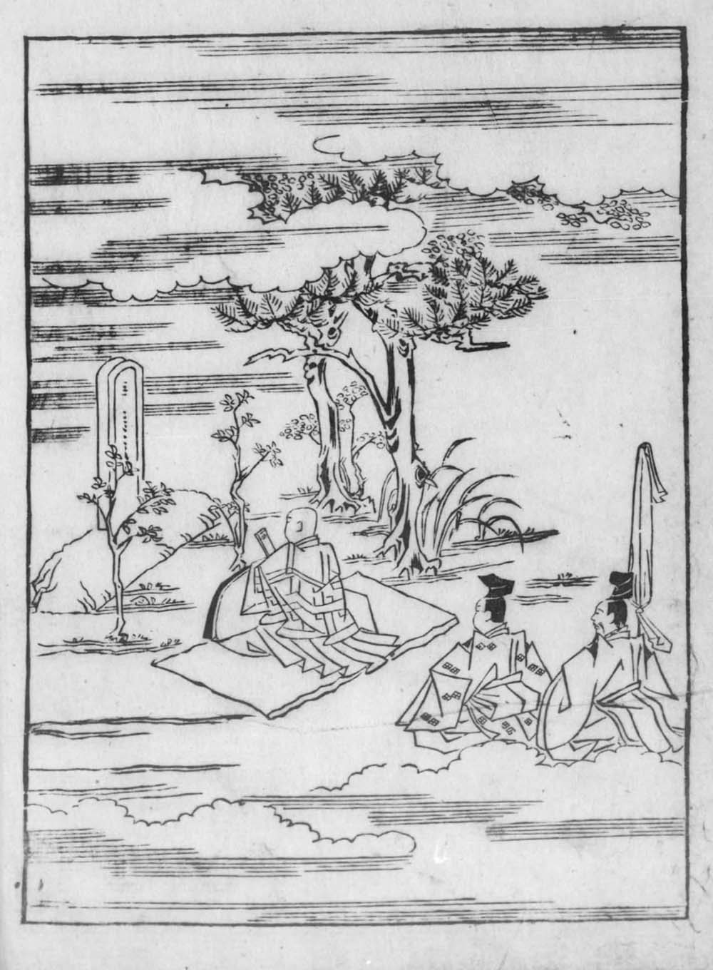 現在知られている『源氏物語』には、主人公である光源氏の死が描かれていません。しかし、平安時代末期以来、光源氏の死を描いた「雲隠」という巻があったという伝承があります。この「雲隠」巻は、実際には現存しておらず、あくまで「そういう巻があった」という伝承だけが語られていました。『源氏雲隠抄』は、この伝承に基づき、同名の「雲隠」巻で光源氏の出家と死を描きます。つまり、伝説に過ぎなかった「雲隠」巻に、後人が実態を与えたのが本作です。作中では、光源氏は、十三回忌に亡き紫の上の墓参りをした後に姿を消したと語られます(図)。この他に、「巣守」巻では光源氏の孫にあたる匂宮(におうのみや)が即位し、「法の師」巻では光源氏の子(実は柏木(かしわぎ)の子)の薫(かおる)が出家するなど、『源氏物語』本編には描かれない、「宇治十帖(うじじゅうじょう)」の続きも語られます。なお、本作の本文は、岩波文庫の今西祐一郎編注『源氏物語補作 山路の露・雲隠六帖他二篇』(岩波書店、2022年12月) でお読みいただけます。