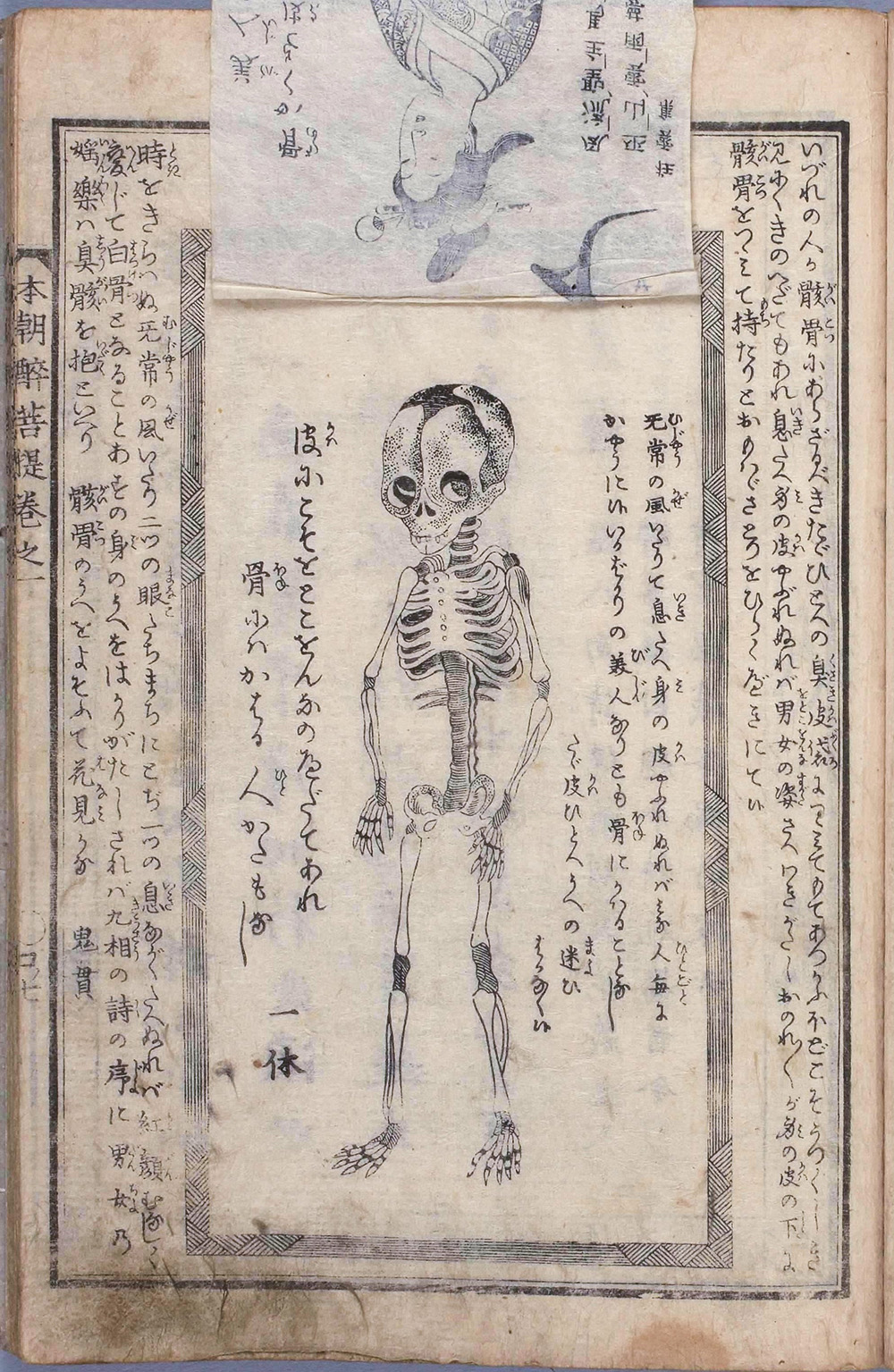 絵の構想は京伝自身であるが、描いたのは初代歌川豊国。その描く骸骨図をよくよく眺(なが)めてみると、少し奇妙である。斎藤月岑(さいとうげっしん)『増補浮世絵類考(うきよえるいこう)』の歌川豊国の項に、「此図杦田氏の解体新書を見て画(かき)しは尤(もっとも)なれど、誤て小児の骨を写(うつせ)り。笑ふべし」とある。豊国が描いたのは、杉田玄白他訳『解体新書』「妊娠篇図」からで、胎児(たいじ)の骸骨を写しとっていたのだった。当時の人々の、人体に関する知識のレベルを考えれば、それも納得、と言うところか。
