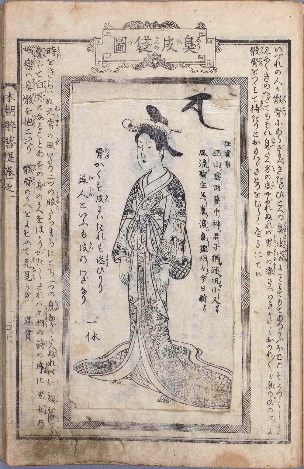 文化6年(1809)9月に刊行された、山東京伝著・歌川豊国(うたがわとよくに)画の読本(よみほん)『本朝酔菩提全伝』六冊のうち、首巻口絵(くちえ)にある仕掛絵(しかけえ)を紹介したい。木版印刷の本書は、表紙を含め、造本に大変凝(こ)った趣向があり、とりわけこの仕掛絵は、手間のかかるものゆえ、初刷(しょずり)本にしか存在しない。「臭皮袋図」と題されたこの2枚の絵の周(まわ)りには、「息たへ身の皮やぶれぬれば、男女の姿さへわきがたし。おのれおのれが身の皮の下、骸骨をつつみて持たりとおもはば、さとりをひらくべきにて候」(意訳命が尽き、体が朽(く)ち果てたなら、もはや男女の姿も判別しがたいものだ。男も女も、各々の皮膚の下は、誰しも同じく骸骨を包むだけと思ったならば、悟(さと)りの境地に至ることができよう)とある。男も女も(その美醜も)表層的に過ぎず結局は同じ、という訳である。ほかにも「九相(きゅうそう)の詩の序に、婬楽(いんらく)は臭骸(しゅうがい)を抱(いだく)といへり」との表現も確認できる。快楽に溺(おぼ)れ、抱(だ)き合ったところで、結局はただの朽(く)ちゆく肉体を抱いているに過ぎないとは、なんとも醒(さ)めた眼差(まなざ)しではないか。死屍(しし)が朽(く)ち果てていくさまを観察し、俗世への執着を断ち切る「九想観(くそうかん)」(九相観)という仏道の修行法がかつて存在し、西洋でも「死を想え」を意味するメメント・モリ(memento mori)という警句があるように、古今東西に通底する思想だった。京伝の愛用書の一つに、中国の詩人蘇東坡(そとうば)の作とされた九想詩の註釈書(ちゅうちゃくしょ)、元禄7年(1694)刊の『九想詩諺解(くそうしげんかい)』があるが、先の一文はその序文から引いたもの。たとえば遊廓の一コマを描いた京伝洒落本(しゃれぼん)の代表作で、寛政2年(1790)刊「傾城買四十八手(けいせいがいしじゅうはって)』にも「東坡先生曰(いわく)、男女の婬楽は、互ひに臭骸を抱と、宜(むべ)なり」とあり、読本ジャンルを含め、しばしば京伝はこのテーマを採(と)り上げる。山東京伝という作者を理解する上での重要な事柄の一つであり、その表現を、視覚化したことにより一目瞭然(いちもくりょうぜん)となったのが、この仕掛絵であった。