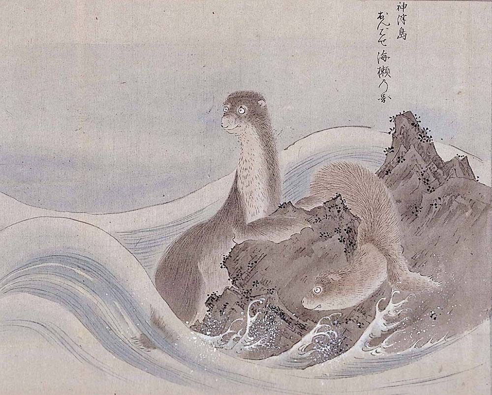 ここに掲出した「おんばせ 海獺(うみうそ)の図」は『図絵』にはなく『絵巻』のみに載せられた絵で、神津島近くにある恩馳島(おんばせじま)に棲息するアシカ(海獺)を描いたものです。巡察中の羽倉の日記『南汎録(なんぱんろく)』の天保9年閏4月25日の記事には、「恩馳島はもっとも大きく、周囲一里余、石の磯があり、アシカが群れ棲んでいる(中略)従者と銃でアシカを打ったところ、洞の口にいた乳のあるアシカが悲しげに叫んで去らないので、それを放すように命じた」(原漢文、金山正好訳)と記されています。