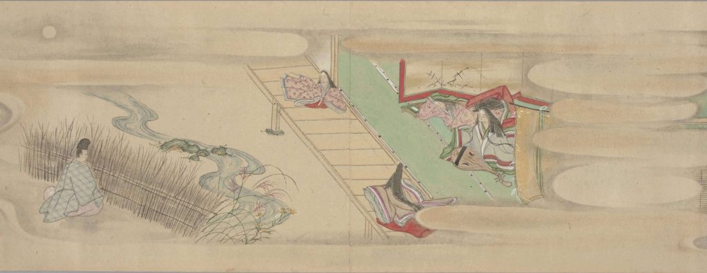 また、高橋亨(たかはしとおる)氏ご架蔵の伝土佐光淳(とさみつあつ)筆「源氏画帖(粉本(ふんぽん))」とは11場面全ての図様が一致しますが、この粉本には「浮田蔵」という墨書があるとの由が注目されます。たとえば橋姫(はしひめ)巻(図2)では、左下に小柴垣(こしばがき)のもとに座って垣間見(かいまみ)をする薫が描かれていますが、こうした珍しい図様も雪信本・粉本・当館蔵本に共通のものです。このあたりの関係性については、今後の調査によっていろいろなことが分かってきそうで楽しみです。