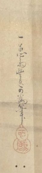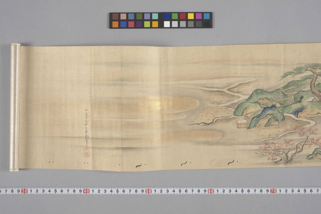 今回ご紹介する伝浮田一蕙(うきたいっけい)(1795〜1859)筆「源氏物語絵巻」は、『源氏物語』の桐壺(きりつぼ)巻から手習(てならい)巻までの53場面(夢浮橋(ゆめのうきはし)巻を欠く)をおさめた2巻の絵巻です。土佐光文(とさみつぶみ)(1812〜1879)による極書(きわめがき)が付属し、各巻末尾には「一蕙斎(いっけいさい)豊臣可為(よしため)筆」の墨書に「可為」の朱文瓢箪(ひょうたん)形印が捺されています(図1)。