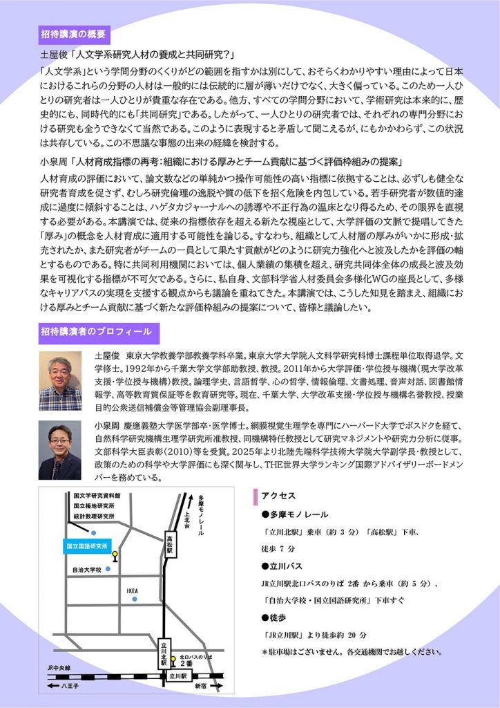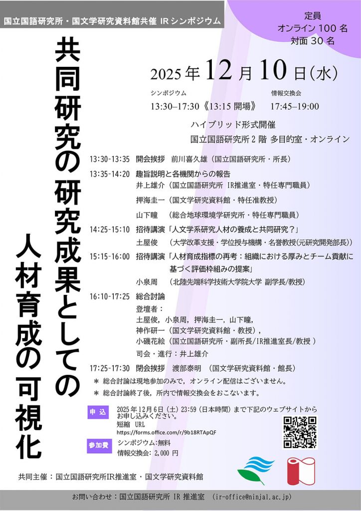 2025/11/11 各種イベント 2025年12月10日(水)に、国立国語研究所と共催でIRシンポジウム「共同研究の研究成果としての人材育成の可視化」を開催します。 2025年12月10日(水)に、国立国語研究所 と2025年度 国立国語研究所・国文学研究資料館共催IRシンポジウム「共同研究の研究成果としての人材育成の可視化」を開催します。 詳細は以下のフライヤー、または国立国語研究所のご案内をご参照ください。
