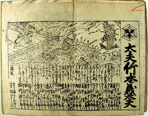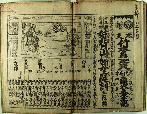 画像掲載の番付は、明和8年(1771)11月5日から京都の亀谷久米之丞座〈かめやくめのじょうざ〉で「妹背山婦女庭訓〈いもせやまおんなていきん〉」を上演した時のもの。2枚続きの番付で、1枚目に義太夫節の太夫と三味線の連名、2枚目に人形役割が記されており、それぞれ上半分には、この芝居の場面が描かれている。