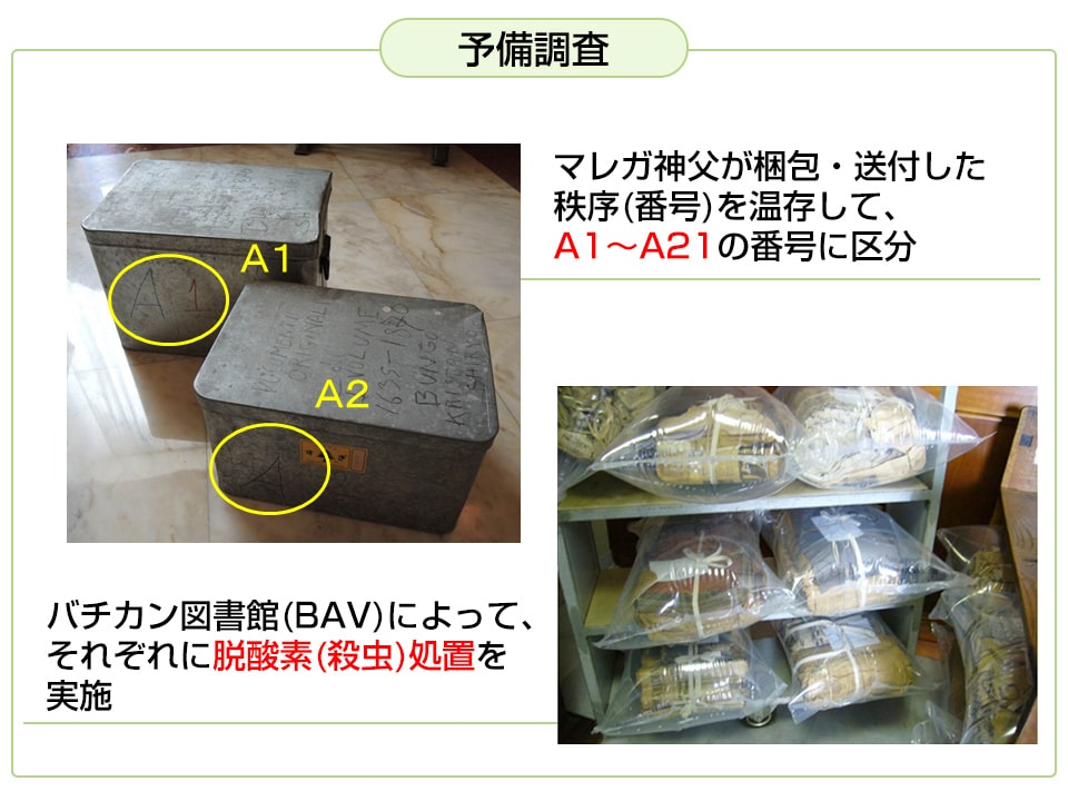 この発見を受け、バチカン図書館から日本へ調査協力の依頼があり、2013年同年11月、バチカン図書館と人間文化研究機構とが、この史料群の調査協力についての協定を締結しました。人間文化研究機構は日本関連在外資料調査研究事業のなかにこの調査を位置付け、共同研究「バチカン図書館所蔵マリオ・マレガ収集文書の保存・公開に関する調査・研究」班(代表大友一雄)を発足させました。また、バチカン図書館職員と日本側関係機関、そして内外の研究者による「マレガ・プロジェクト」が正式に活動を開始しました。日本側機関には、人間文化研究機構国文学研究資料館、同国立歴史民俗博物館、東京大学史料編纂所、大分県立先哲史料館が参加し、国文学研究資料館が代表機関を務めました。活動は2021年度まで続き、劣化資料の修復、デジタル撮影、目録作成などの取り組みを通じてすべての資料が画像データベースによって公開されました(「マリオ・マレガ資料データベ-ス」)。