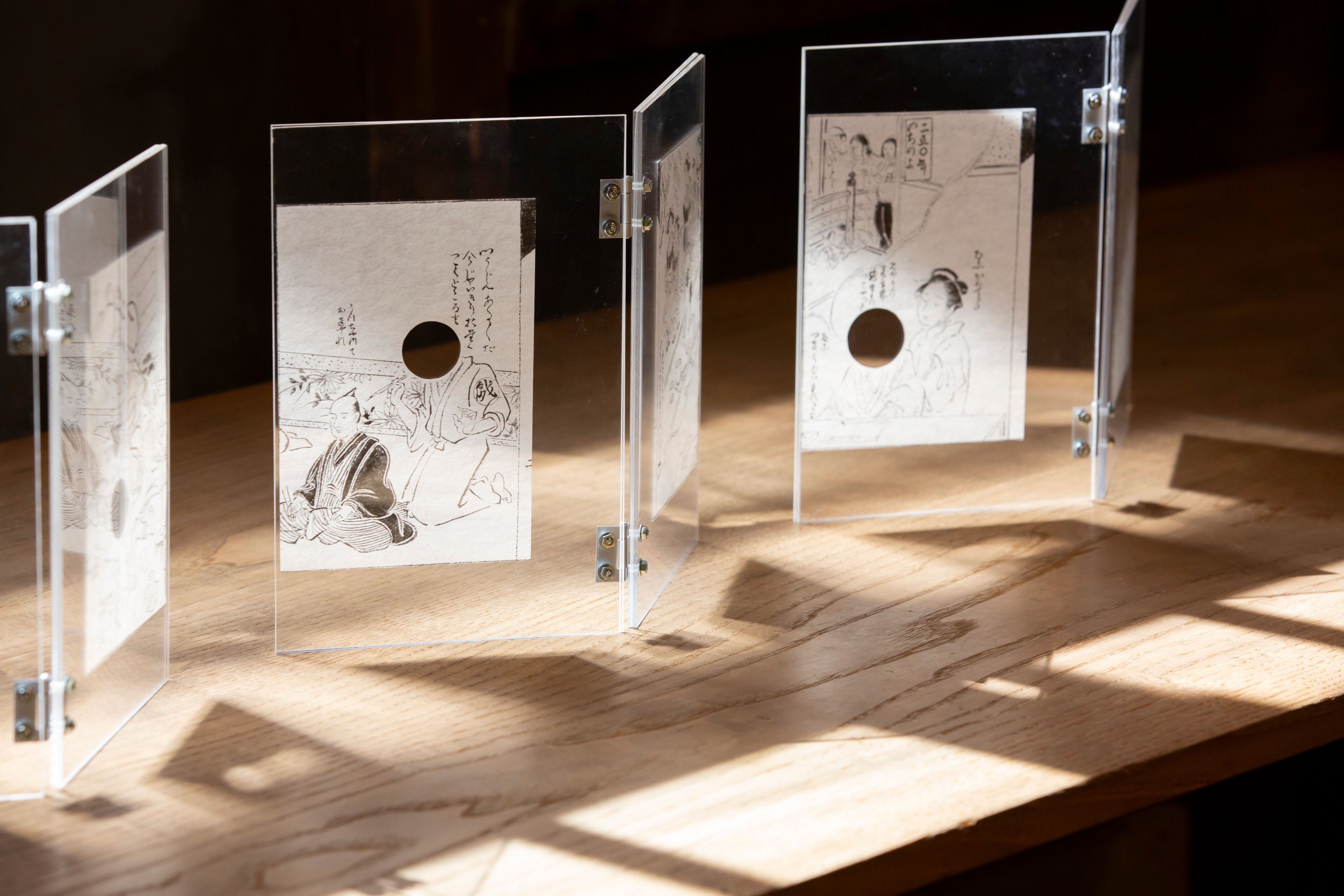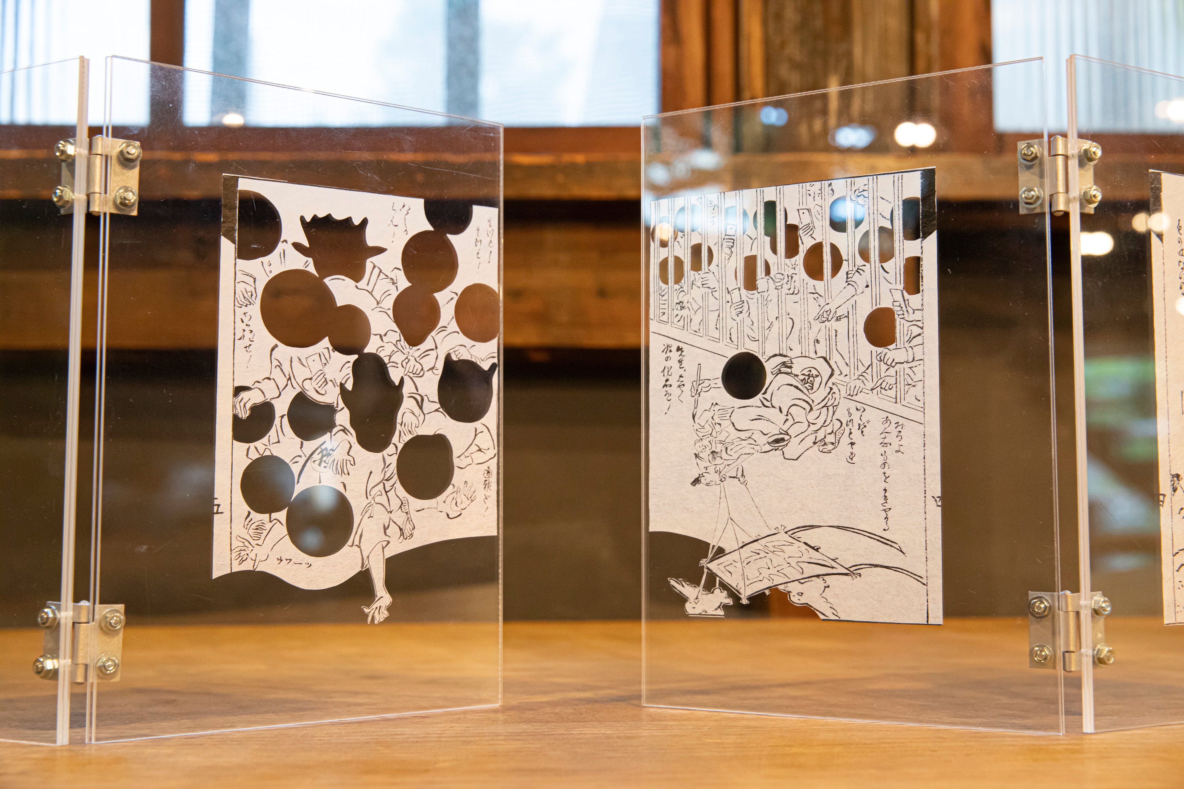 誰も気づかないことを鋭く指摘する「穴をうがつ」という戯作の手法を、作品に穴をあけることで表現しました。